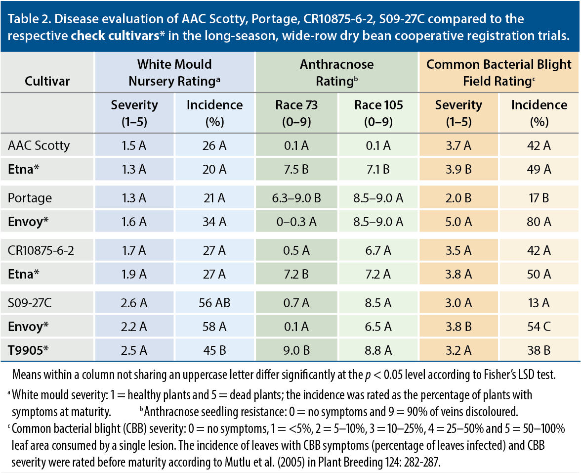 AAC Scotty was registered in 2017 and distributed by Canterra Seeds in Winnipeg/Meridian Seeds in North Dakota. This cranberry bean variety is high-yielding, reaching an average yield of 125% of the check cultivar, Etna (Table 1). The seed size of AAC Scotty (428 g/1,000 seeds) is slightly larger than Etna (415 g/1,000 seeds). The average maturity of AAC Scotty (97 days) is five days later than Etna (92 days). AAC Scotty is resistant to anthracnose (races 73 and 105), while Etna is susceptible (Table 2). And Scotty also has better resistance to common bacterial blight (CBB) than Etna. More information can be found in a publication on AAC Scotty cranberry common bean in the Canadian Journal of Plant Science (CJPS) (doi.org/10.1139/CJPS-2018-0110).