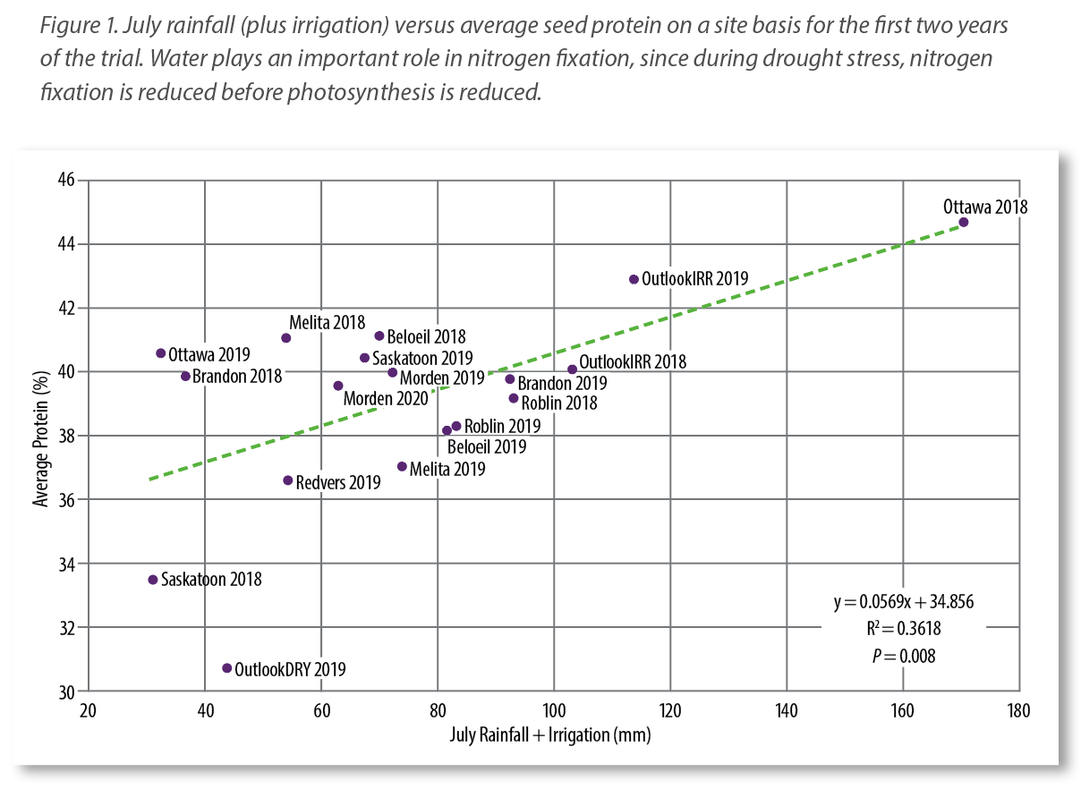 Since soybean seed protein is often lower in western versus eastern Canada, a CFCRA project was funded to address lower soybean seed protein in western Canada. A series of 20 low to high protein lines have been grown since 2018 at sites across Canada. Seed protein content and quality are being evaluated and compared to climate data at each site. In a preliminary analysis undertaken by scientists at AAFC–Brandon, water accumulation during July was seen to play an important role in seed protein content (Figure 1). Drought stress may play a role in final seed protein since nitrogen (N) fixation will be reduced in soybean plants before photosynthesis starts to be reduced. Reduced N fixation may result from even minor drought stress and may be responsible for some of the lower seed protein levels seen in western Canada. The final year of this trial has been grown in 2021 and will allow us to examine the effect of drought stress across the prairies seen this summer. In addition, genomic scientists at AAFC–Ottawa are examining gene expression differences from multiple sites across this trial. The objective is the identification of geographically important genes for protein content.