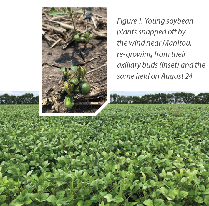 Heavy winds blew soil into furrows and crop residue into clusters, increasing seed depth and hindering emergence in some spots. One mid-June windstorm hit parts of the south-central region pretty hard. We discarded our wide-row dry bean variety evaluation trial at Winkler due to wind damage and edible bean plants were ripped from the ground in a commercial field nearby, reducing plant stand by 30%. The same storm tattered a large swath of soybeans at the west end of a field to the point that they looked like they were gone. But they were miraculously regrowing within the week and the field bounced back as if nothing ever happened (Figure 1).