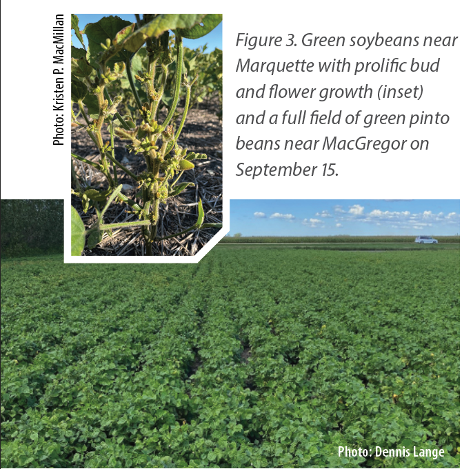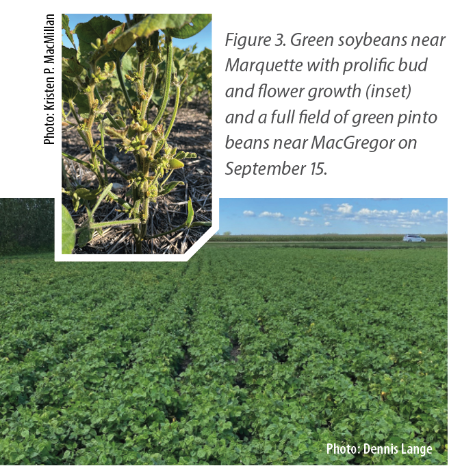 In mid-September, there were a few unique reports of soybean plants remaining green. Fields had either the odd green plant, small patches or a large section of green toward the headlands, where the rest of the field was harvest- ready. In one case, plants had prolific growth of buds and flowers, especially in low spots. Affected plants had few to no pods and didn’t have any hope of contributing to yield at that late date. There were also a couple of edible bean cases around the same time, where entire fields stayed green with reduced pod set. These issues appear to be strongly linked to drought conditions during flowering and the subsequent shift to better moisture in August that triggered regrowth. We still don’t know exactly what was causing this, but we are considering the greenstem disorder and male sterility as potential causes (more on page 42) and we are investigating viruses.
