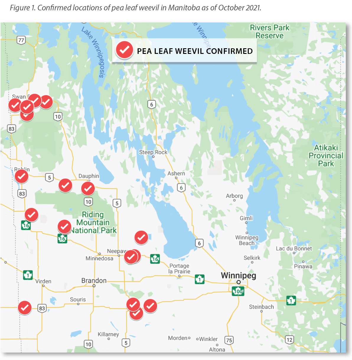 It was first detected in Manitoba in 2019 in the Swan River Valley and has since expanded. This fall, adult pea leaf weevils were found in pea and faba bean fields throughout western Manitoba (Figure 1).
