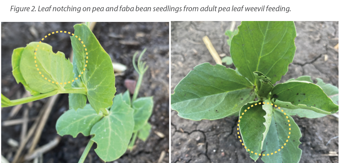 The primary feeding and reproductive hosts of pea leaf weevil are field peas and faba beans. However, adult weevils will feed on a variety of secondary hosts, including clovers, alfalfa, chickpeas and soybeans. Damage to the secondary hosts is not typically economical except at unusually high densities on establishing alfalfa fields. Adult pea leaf weevils emerge from overwintering sites along field margins close to their secondary hosts (e.g., forage alfalfa or clover fields) in the spring. Initially, they feed on secondary host plants before dispersing into fields where field pea and faba bean seedlings are emerging. After arriving in pea and faba bean fields, adults feed, making ‘u’-shaped notches along the leaf margins (Figure 2). Within a few days of feeding, adults mate and females begin to lay eggs; weevils are long-lived and individual females may lay over 1,000 eggs from June to August. When the eggs hatch, first instar larvae chew their way into the root nodules of pea and faba bean plants, where they feed on the bacteria that fix nitrogen inside the nodules. Larval feeding damage is generally considered to be more serious than adult damage in terms of yield loss. After completing their development, larvae pupate in the soil and a new generation of adult weevils emerges, usually beginning in late July or early August. New generation adult weevils feed on any remaining green pea and faba bean plants and then disperse to find secondary hosts where they feed until temperatures drop and overwintering begins.