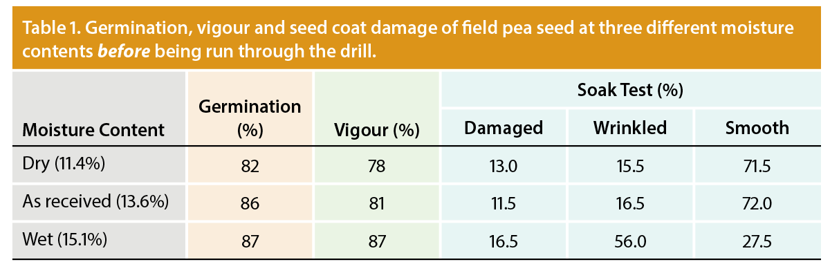 Seed moisture content had the most significant impact on germination, vigour and seed coat damage (percentage of damaged, wrinkled and smooth). Pea seed that had been dried to moisture contents below recommended levels (11.4% seed moisture) had significantly lower germination and vigour (a more than 10% decrease) compared to the “as-received” seed (13.6% seed moisture) and the wet seed (15.1% seed moisture). Reduced germination and vigour will negatively affect plant stand and plant establishment, reducing crop yield potential. These results reflect similar findings from previous PAMI research on air seeder distribution and seed
