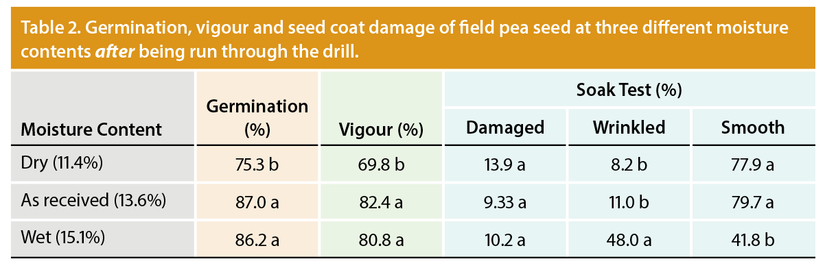 Ensuring seed moisture content is at the recommended level is imperative for good seed germination, vigour and seed coat quality. These results indicate that initial moisture content, before running the seed through the drill, is an important factor for maintaining seed quality and establishing a successful crop.