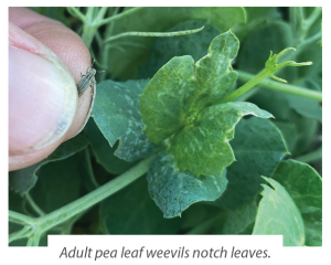 Adult pea leaf weevils notch leaves
