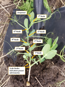 - To properly determine field pea growth stage, dig up plants to identify scale nodes as they are not counted when staging.