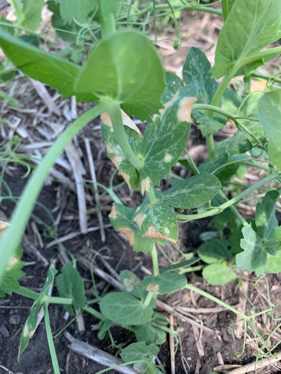 Suspected environmental stress in field peas in St. Leon, pea leaf notches on lower leaves. June 29