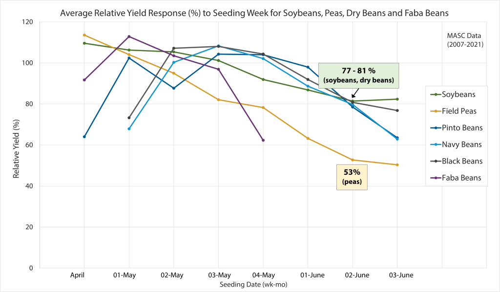 Relative yield response to seeding week (wk-mo) for soybean and pulse crops with data for seeding in the second week of June highlighted.