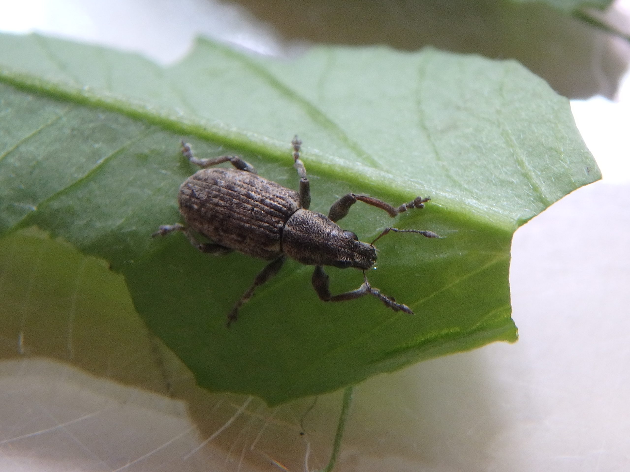 Pea leaf weevil adult that overwintered in a perennial clover patch near Gladstone – May 30, 2022. - Pea economic threshold: 30% of plants with notches on the uppermost closed stipule.