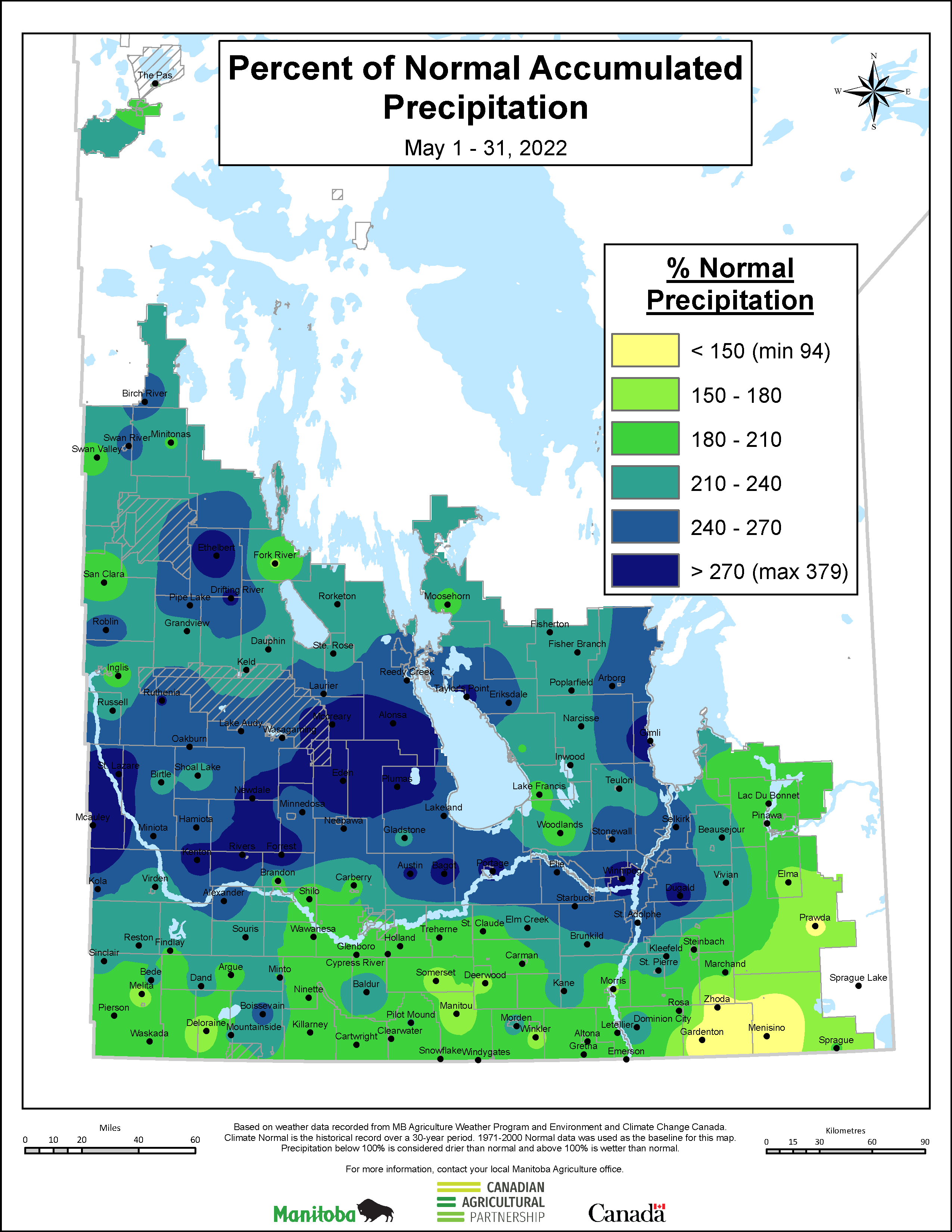 - For most of the province, accumulated rain over the month of May was more than 150% of normal. For the northern parts of Manitoba, rainfall amounts reached above 200% with some areas accumulating over 300% of normal.