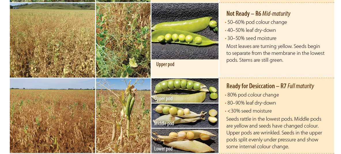- Peas are ready for desiccation, preharvest weed control or swathing when at least 80% of the field is at R7 (full maturity). This is when 80% of pods are ripe, golden-brown and seed moisture is less than 30% in the least mature parts of the field.