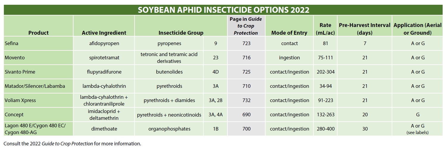 - If control is necessary, assess product efficacy following application to ensure aphids have been controlled. Pyrethroid-resistant soybean aphids were verified in Manitoba in 2017 and have been reported in the states where our aphid populations blow in from.