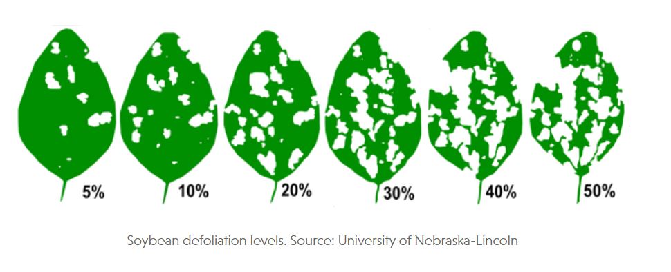 - Soybeans and dry beans are at reproductive staging and thresholds are lower than during vegetative growth. The defoliation threshold from bloom to pod fill is 15% and from pod fill to maturity is 25%. Unless pod feeding is observed, low levels of defoliation will not cause economical yield loss.