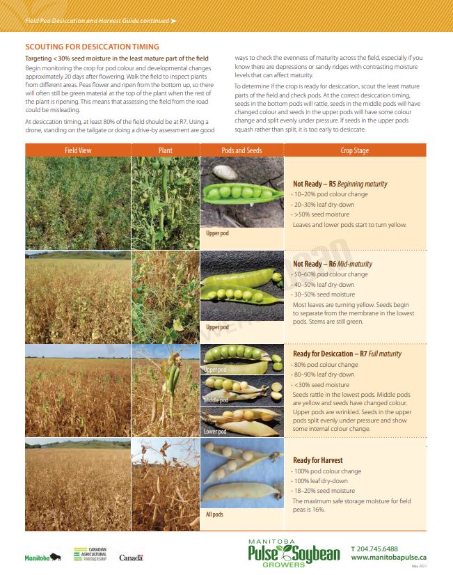 To determine if peas are ready for desiccation, scout the least mature areas of the field and check pods. Seeds in the bottom pods should rattle, seeds in the middle pods have changed colour and seeds in the upper pods will have some colour change and split evenly under pressure rather than squash. MPSG’s Field Pea Desiccation and Harvest Guide is a helpful resource featuring a picture guide to time applications, along with harvest and storage tips.
