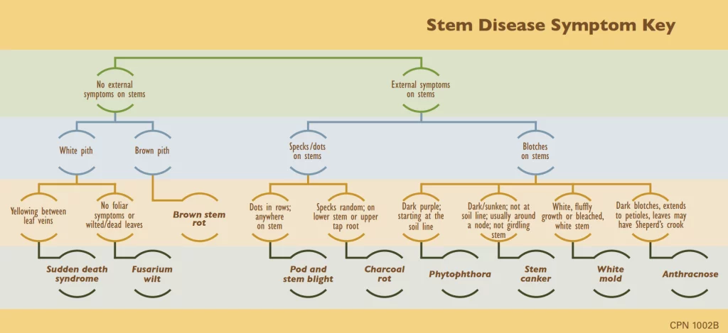 - Phytophthora root and stem rot: late infection appears as a chocolate brown lesion on the stem that extends upwards from the soil line. If roots are rotten, suspect PRR. If roots appear healthy, northern stem canker may be suspected.