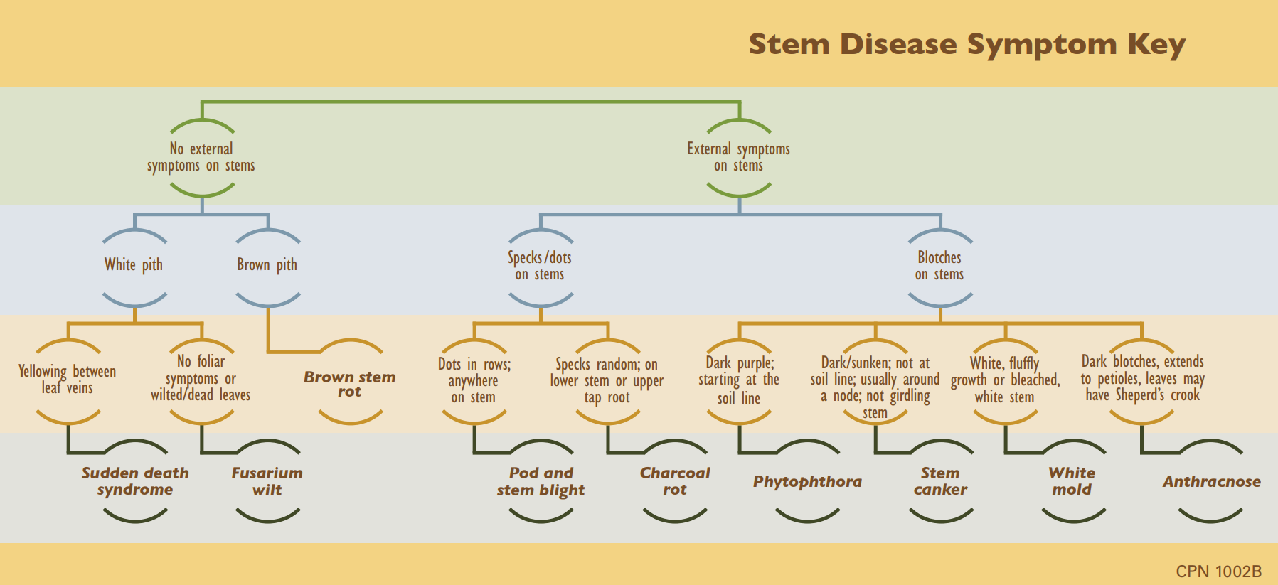 - Phytophthora root and stem rot: late infection appears as a chocolate brown lesion on the stem that extends upwards from the soil line. If roots are rotten, suspect PRR. If roots appear healthy, northern stem canker may be suspected.