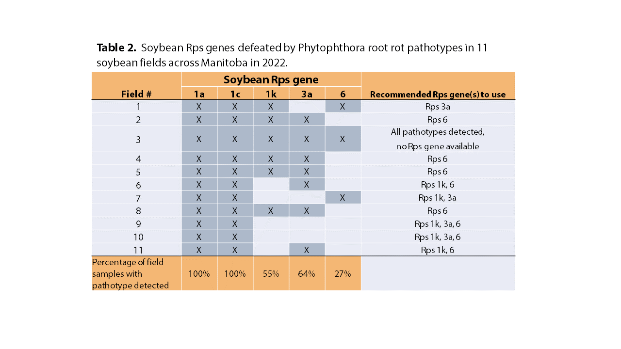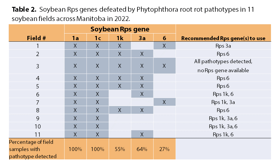 In 2022, MPSG agronomists piloted a commercial soil test from AYOS technologies to identify PRR pathotypes in 11 farmer’s fields (Table 2). Of those 11 fields where PRR was confirmed, 100% of fields had PRR pathotypes that overcame soybean Rps genes 1a and 1c. Rps genes 1k and 3a were defeated at 55% and 64% of fields tested, respectively, and Rps 6 was defeated at 27% of PRR-infected fields. Soil tests to identify PRR pathotypes present in fields planned for soybeans will be an important tool to inform variety selection so farmers can choose effective Rps genes resistant to the PRR pathotypes present.