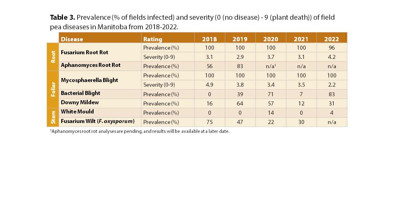 In 2022, 49 pea fields in Manitoba were surveyed for root diseases at R1 (early flower) and 48 fields were surveyed for foliar and stem diseases at R4 (full pod). Soil samples were collected for Aphanomyces root rot detection.