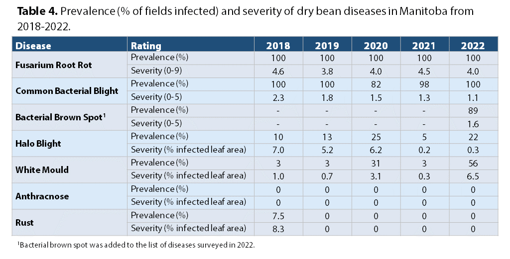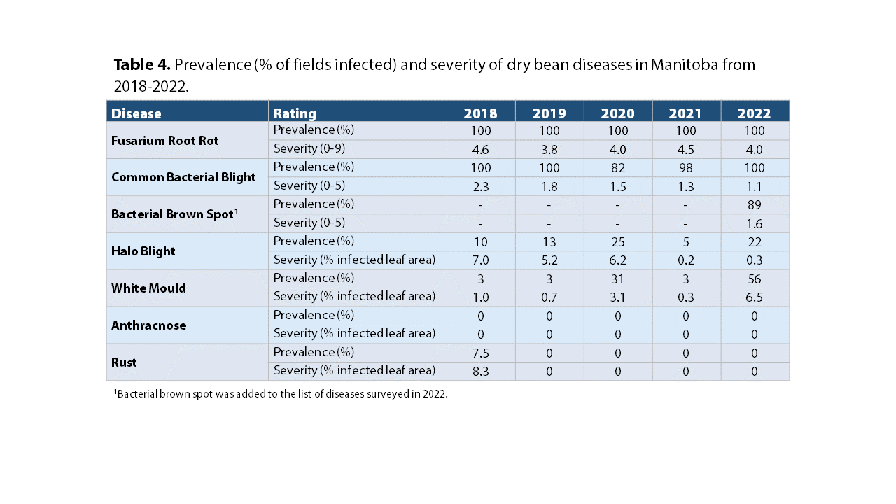 Common bacterial blight was the most common foliar disease, found in every dry bean crop surveyed with an average severity of 1.1 (range: 0.3-2.7) on a scale of 0-5. Bacterial brown spot was the next most common foliar disease, observed in 89% of fields with an average severity of 1.6 (range: 0.7-3.0) on a scale of 0-5. White mould was found in 57% of dry bean fields and the average percentage of plant tissue infected (stems and pods) was 6.5%.