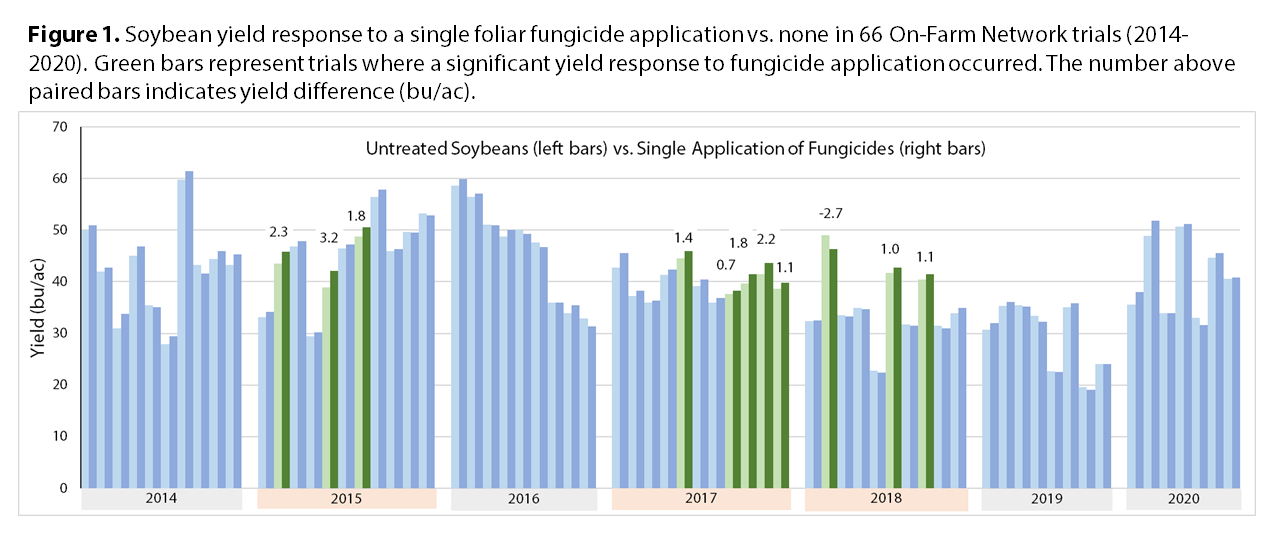 Figure 1. Soybean yield response to a single foliar fungicide application vs. none in 66 On-Farm Network trials (2014-2020). Green bars represent trials where a significant yield response to fungicide application occurred. The number above paired bars indicates yield difference (bu/ac).