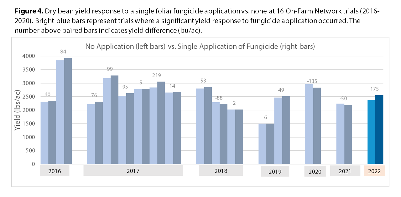 Since 2016, a single application of foliar fungicide applied at R2 (early pin bean) has been compared to untreated dry beans at 16 On-Farm Network trials (Figure 4). White mould and anthracnose are the main disease targets of foliar fungicides in dry beans.