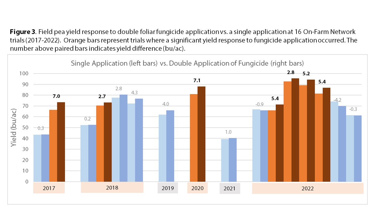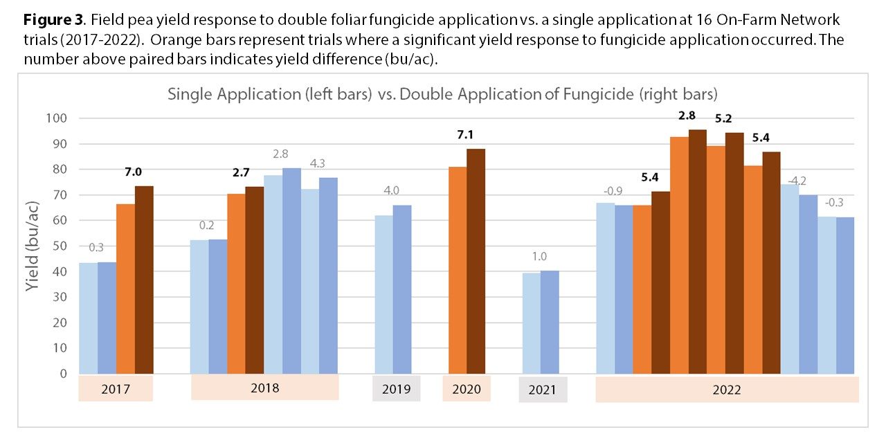 Since 2017, 44 On-Farm Network trials have investigated pea yield response to foliar fungicide applications. Of those trials, 25 have compared a single application vs. none and 16 have comparing a single vs. double application.