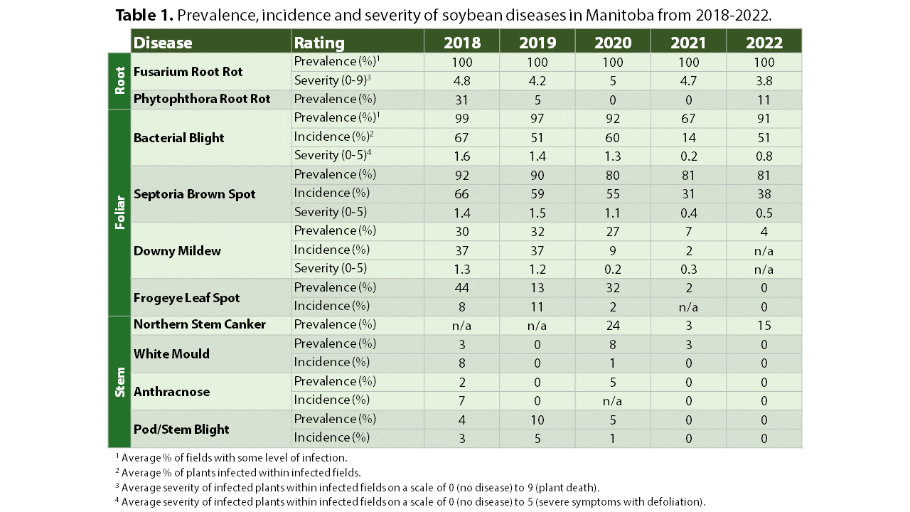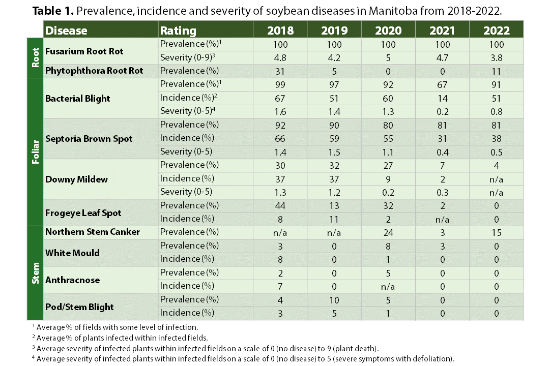 In 2022, 54 soybean fields in Manitoba were surveyed for foliar and stem diseases at R4 (full pod) to R5 (beginning seed). Roots were collected and submitted to AAFC for root disease analysis. Soybeans were visually assessed for infection by bacterial blight, Septoria brown spot, downy mildew, frogeye leaf spot, northern stem canker, white mould, pod/stem blight and anthracnose.