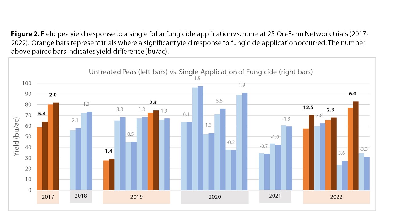 The On-Farm Network (OFN) has also tested foliar fungicides in soybeans, peas and dry beans over the past several years to evaluate the frequency of yield response to these products under a range of environments.