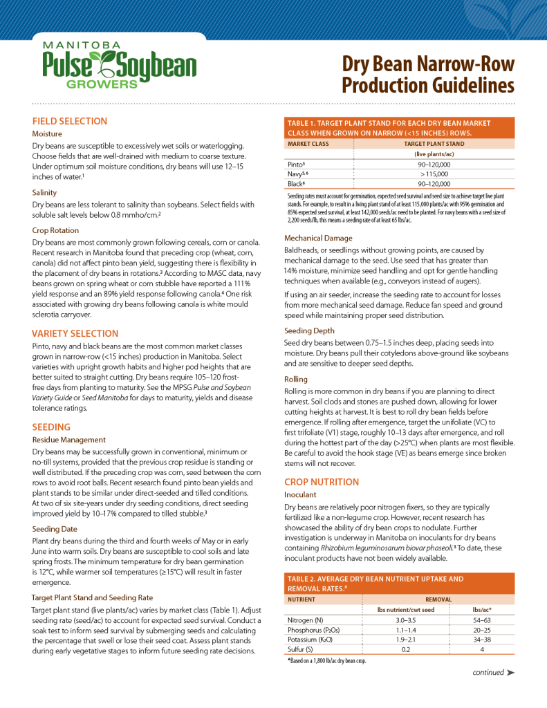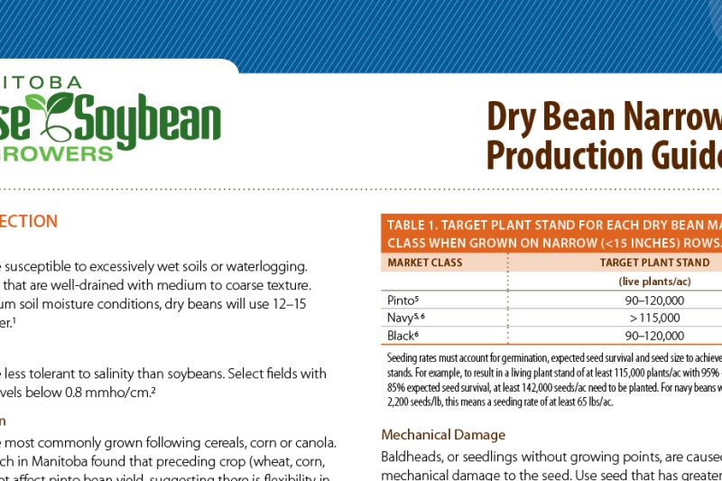 Basic agronomic recommendations for dry beans grown on narrow row widths, including field and variety selection, seeding, fertility, pest management, and harvest and storage.