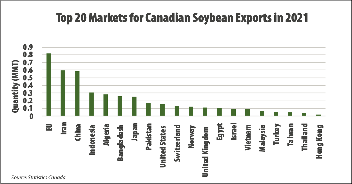 In 2021, Canadian soybean exports were 4.4 million metric tonnes (162 million bushels) representing approximately 70 per cent of production.