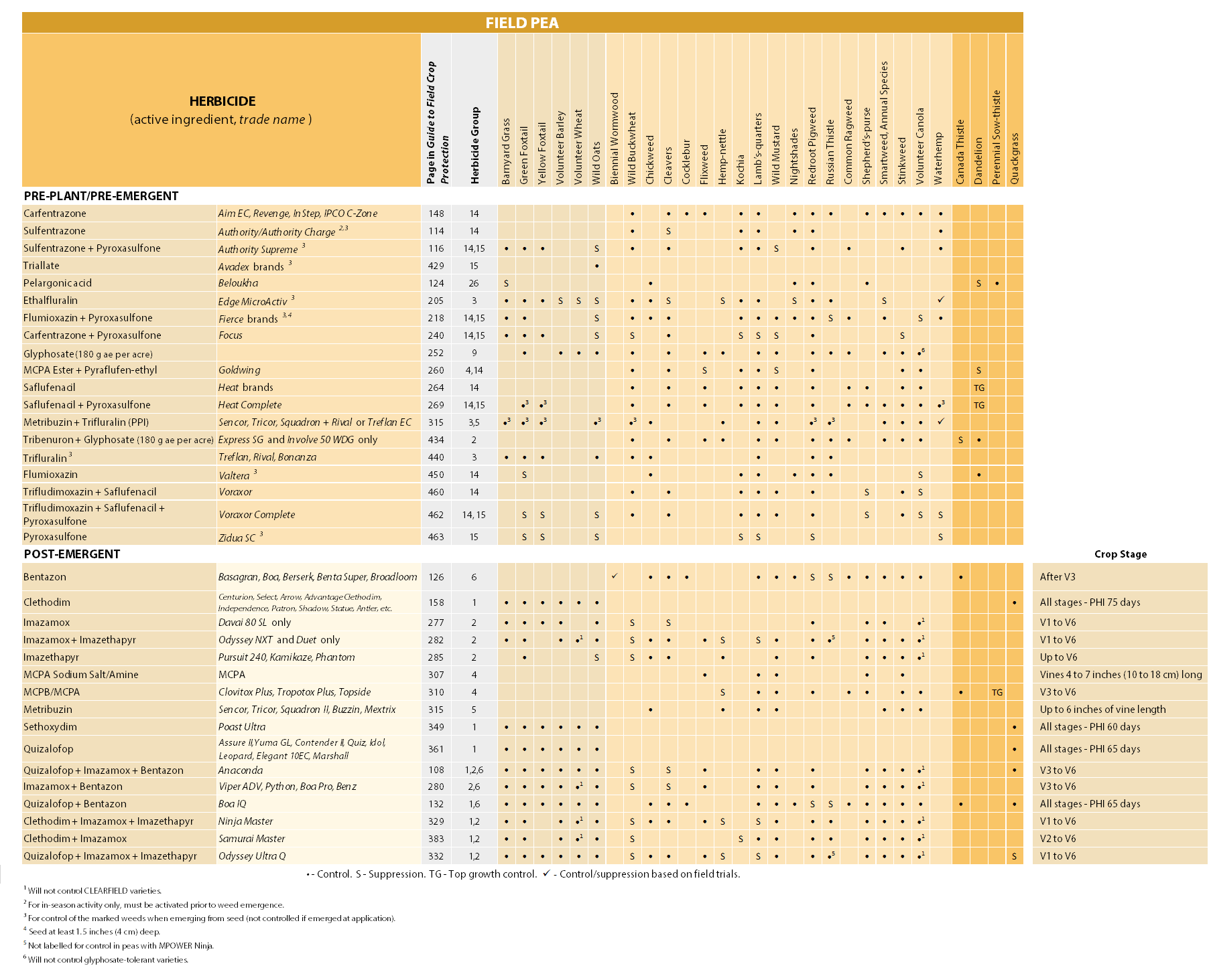 Pre-emergent herbicides can offer control of Group 2-resistant broadleaf weeds, which have limited in-crop control options. Pea yield can be reduced by up to 25% if weed control is delayed until four weeks after emergence.