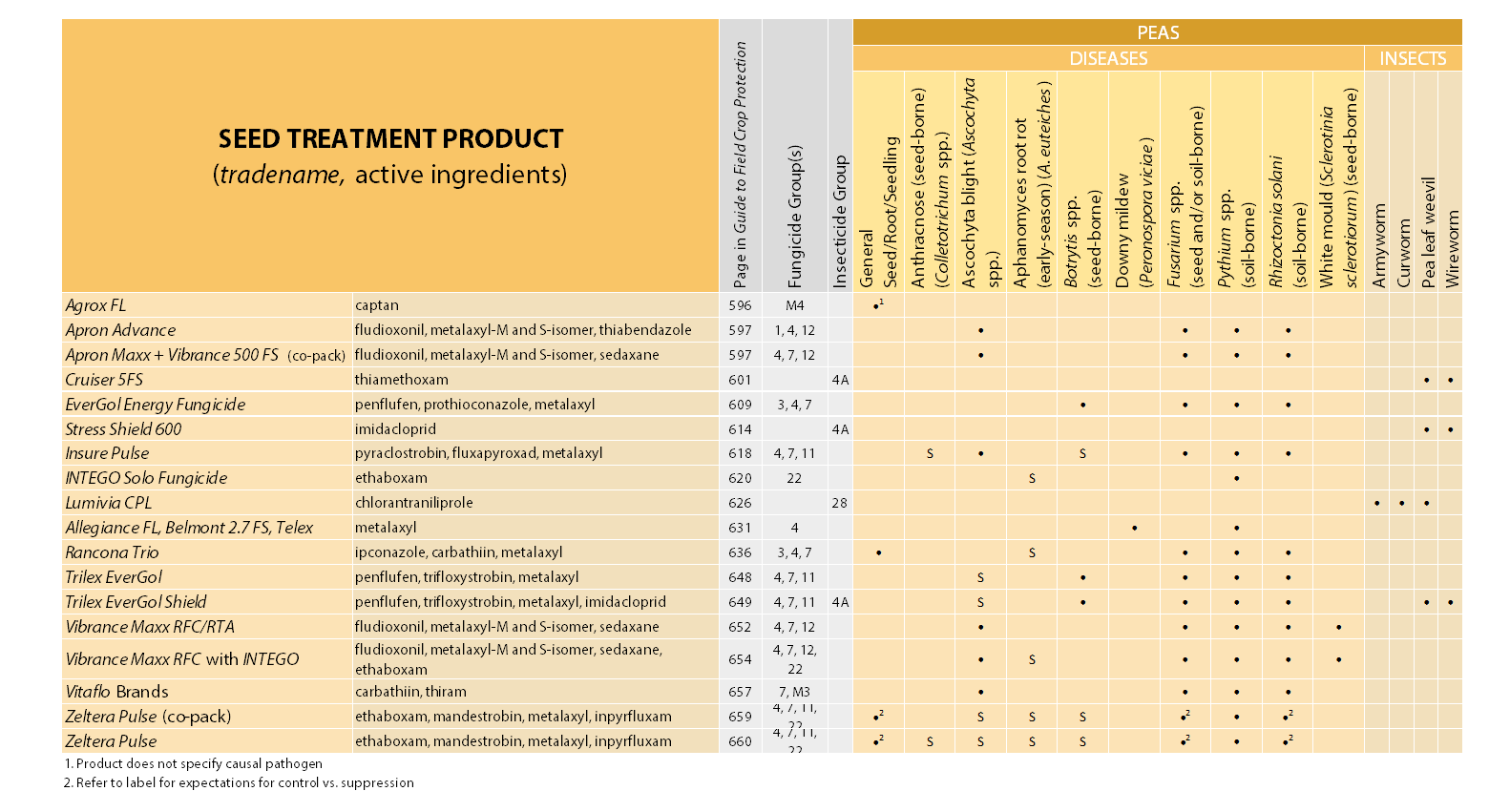 Seed treatments with an insecticide component will offer control or suppression of wireworms, seedcorn maggots, cutworms and pea leaf weevils, depending on the product. If your fields do not have a known history of these insects and are at low risk, consider a fungicide-only seed treatment.