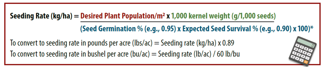 - Target Plant Populations: target 180,000 live plants/ac (45 plants/m2). Seed size can vary widely, from 300 to 750 g/1000 seeds