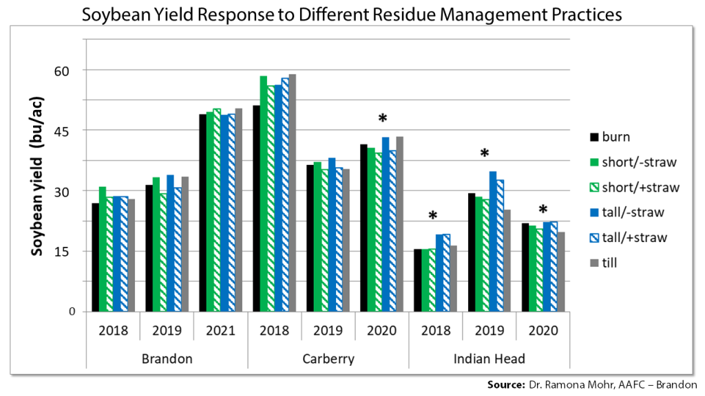 Early seeding dates (May 8-11) resulted in similar or greater soybean yields than late seeding dates (May 24-29). Yields of soybeans direct seeded into standing stubble were the same or greater than yields of soybeans seeded into burned residue or tilled soil. Tall stubble resulted in similar (7 of 9 site-years) or greater (2 of 9 site-years) yields than shorter stubble, with the benefits of taller stubble most common in drier growing conditions (at Indian Head). Removing straw resulted in similar (6 of 9 site-years) or greater yields (3 of 9 site-years) than where straw was chopped and returned to the field.