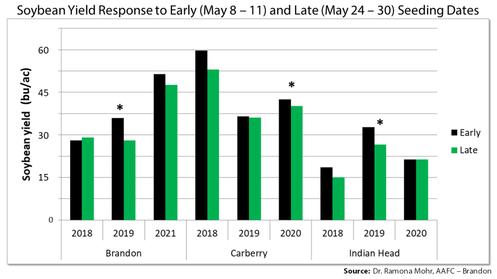 Soybean seeding date is flexible in Manitoba. Aim to seed in the second to third weeks of May. Soybean yields did not differ among seeding dates from May 1 to May 24, but yields were reduced by 15%, on average, when seeding was delayed until May 31 – June 4 in previous research conducted in Manitoba. In the research described above, seeding dates of May 8 to 11 resulted in greater soybean yields than later dates of May 24 – 30.