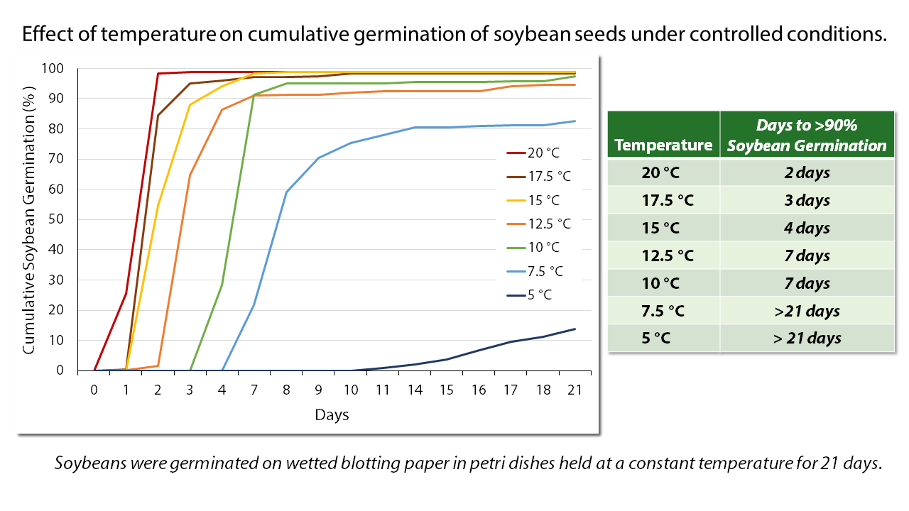 Temperature had the greatest influence on soybean germination, regardless of different seed-related factors. At lower temperatures, there was more variability among seed-factor treatments, suggesting that these factors may be more important when seeding into less than ideal conditions for germination. Germination occurred in under 4 days when temperatures were above 15 °C, in a week when temperatures were 10 – 12.5 °C and complete germination (>90% of seeds germinated) did not occur within 21 days when temperatures were below 7.5 °C.
