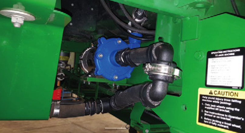 Let’s take a closer look at the tendering system. At the heart of it is a three-inch plumbing system mated to an efficient pump that can deliver about 400 gallons per minute. That will fill an average sprayer tank in three to four minutes. Of course you need to allow for a throttle- back to induct the product, but the whole process can be completed in seven minutes or so. Don’t forget to include the time to reach the tender truck, or to swing the heavy three-inch hose over; it makes sense to minimize that too.
