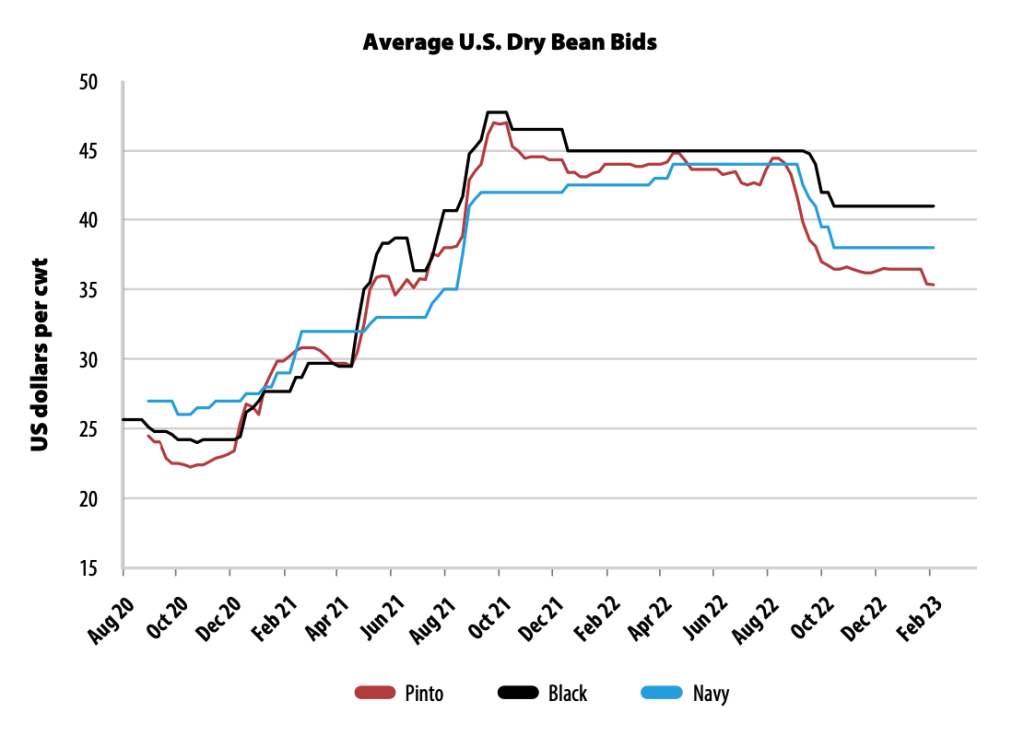 Unfortunately, dry bean bids in Manitoba are a little scarce, but bids from south of the border show a similar pattern as the chart above. Prices already started to climb in 2020/21 with the sharpest rise in the summer of 2021 as the drought persisted. Prices remained at those highs for months and only started to slide closer to the harvest of the 2022 crop. Even with this decline, dry bean bids have remained well above the market prior to the drought.