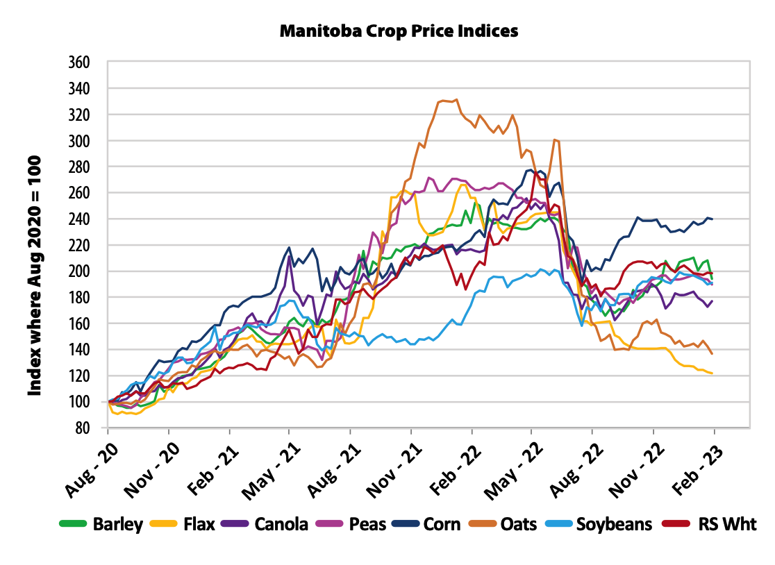 The Manitoba Crop Price Indices chart is busy, but shows all kinds of interesting information. For example, the upward trend in prices started in August 2020, making it clear that all crop markets
