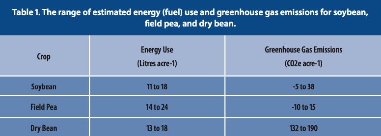 THE GOAL OF this project was to provide information on the energy (fuel) use and greenhouse gas emissions generated from current management practices used for soybean, field pea, and dry bean production in Manitoba. This information was then used to assess potential changes farmers can implement to further reduce greenhouse gas emissions, and to determine areas that require further research and investment for the agricultural industry to increase energy use efficiency and carbon sequestration.