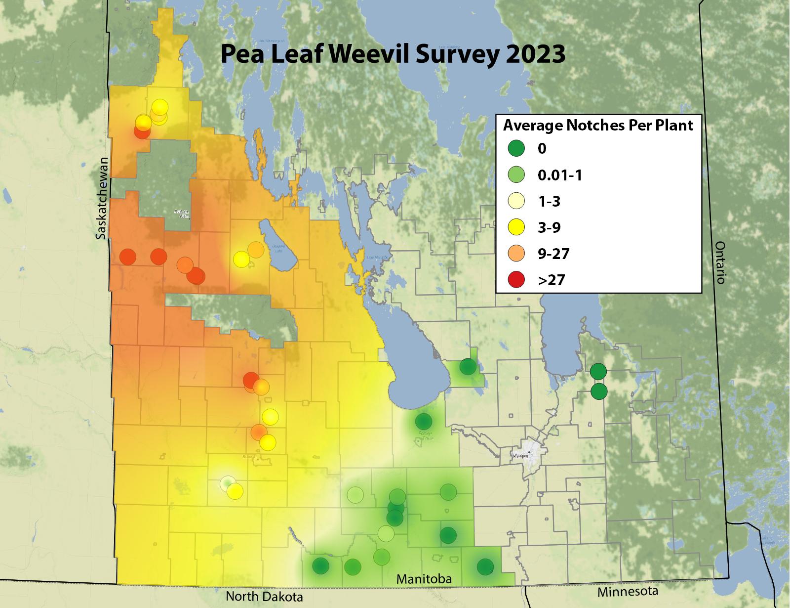 - The spring 2023 pea leaf weevil survey has wrapped up. Early PLW Survey Results → Pea leaf weevil populations were found to be greater than last year in western Manitoba and the pest has been confirmed further east into central Manitoba. Root nodules with signs of larvae feeding damage may be found when digging up plants.