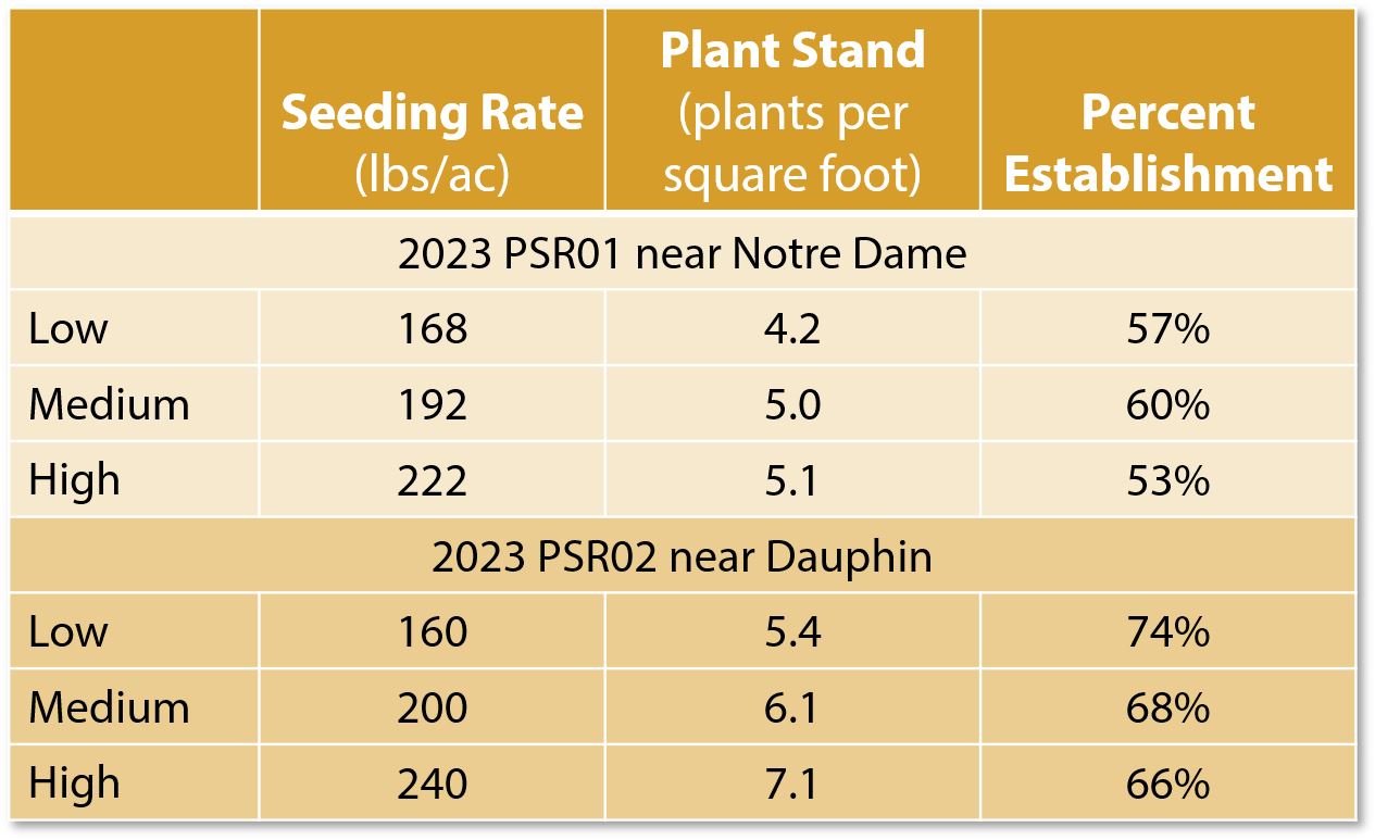 In 2023, trials are comparing anywhere from 120,000 seeds/ac to 220,000 seeds/ac, depending on the trial. Early-season plant counts have shown an average of 80% establishment from the seeding rate, which is the same as the long-term average for early-season percent establishment in these trials. Typically, as seeding rate increases, fewer of the seeds put in the ground establish as a living plant (lower percent establishment) – that trend has held consistent again this year at the majority of trials.