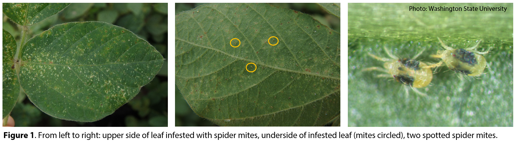 - Two-spotted spider mites have been found at low levels in some fields in central Manitoba. As a pest that prefers hot, dry weather, their populations may increase with the lack of rainfall in some areas. Look for white speckles on the tops of soybean leaves. When you turn the leaves over you may see the tiny mites crawling around underneath. Populations are typically the greatest at field edges. More information on two-spotted spider mites →