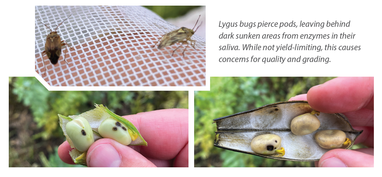 Yield losses are not generally a concern, but quality can quickly be impacted. Lygus pierce pods to suck plant sap. Visible damage is found on the seeds due to enzymes in their saliva. Fabas need to have less than 4% perforated damage to be graded No. 3 Canada or better.