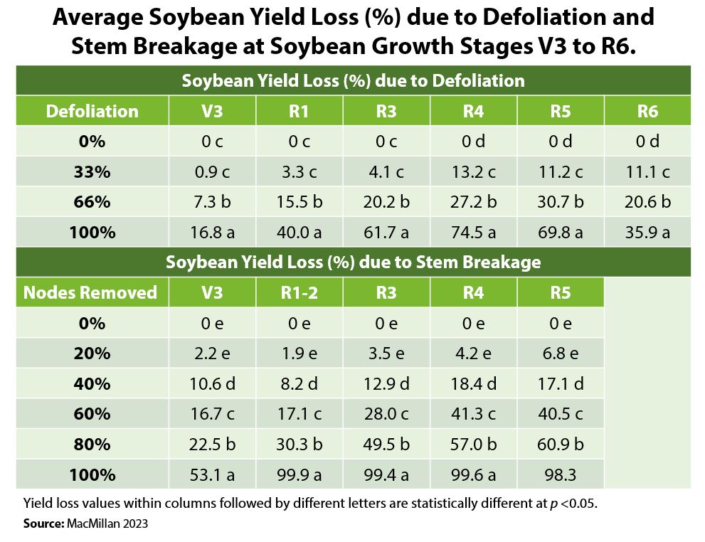 - Hail continues to hit select areas of the province. If your soybeans have been hit by hail, estimate yield loss using the latest research reports from the soybean and pulse agronomy lab. The R5 growth stage is the most susceptible and maturity may be delayed. Yield loss estimates due to defoliation and node breakage from hail →