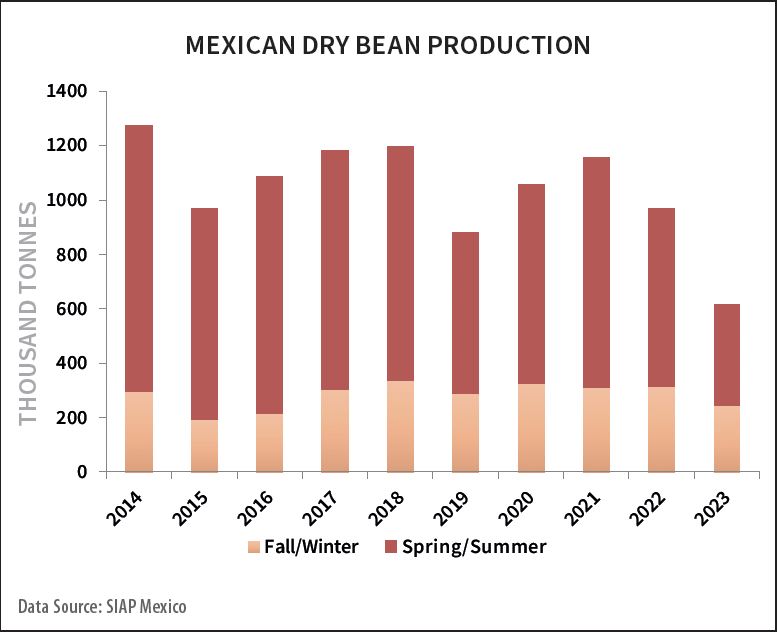 As most dry beans are purchased via forward contracts, spot bids during the rest of the year aren’t very active. As a result, posted bids (where available) aren’t showing much response to the shrinking supplies in Canada and the U.S. For the few uncontracted beans still out there, over-the-phone bids have been strong. The heavy demand from Mexico isn’t expected to slow down any time soon, with very dry conditions in the north of the country damaging its upcoming 2024 winter harvest.
