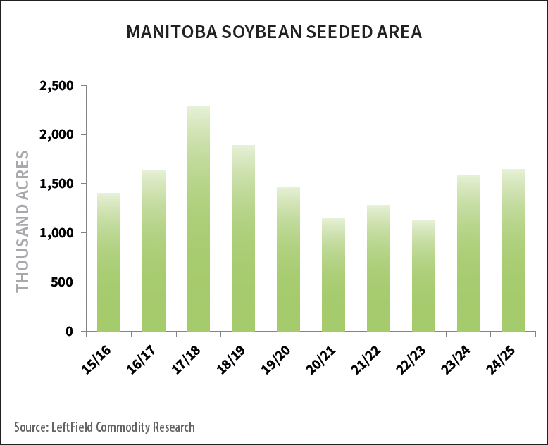Manitoba may see a small increase in soybean plantings in 2024 from last season’s 1.6 million acres, which was the highest since 2018. Prices are down slightly, but soybeans are still a good option on many farms. The larger production in 2023 allowed for a bigger export program out of Vancouver, B.C. something that may be the case again the coming season, which can provide good marketing opportunities for growers.