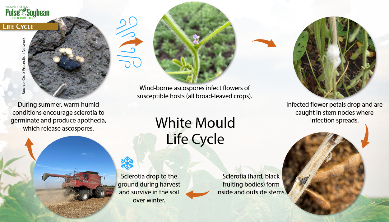 White mould (Sclerotinia sclerotiorum) has a wide host range, infecting most broadleaf crops including canola, sunflowers, soybeans and dry beans. In wet years conducive for disease development, white mould can have major impacts on yield.