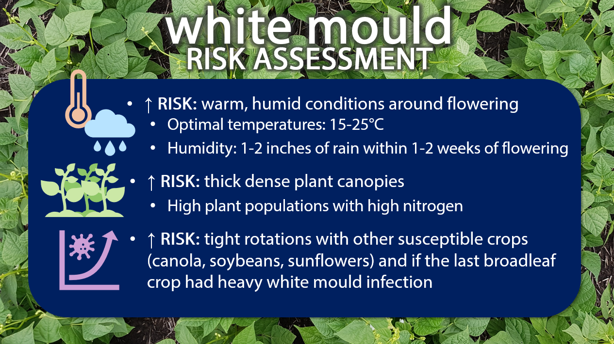 Fungicides for white mould are preventative, meaning they must be applied before symptoms are visible and fungicide decisions need to be made by evaluating risk in the field.