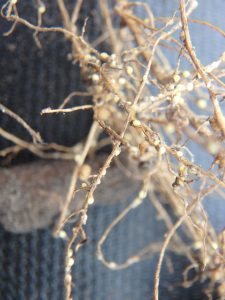 There are no distinct above-ground symptoms unique to SCN. Since SCN impacts water and nutrient uptake, stunting, chlorosis and necrosis are common symptoms, however, once above-ground symptoms are apparent, up to 30% yield loss may have already occurred. As a result, dig up roots in August to look for cysts and to catch this destructive soil-borne soybean pest early.